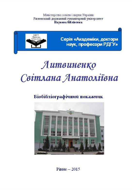 Додаткова інформація (бібліографічний опис): | Литвиненко Світлана Анатоліївна: біобібліогр. покажч. / М-во освіти і науки України, Рівнен. держ гуманіт. ун-т, Наук. б-ка ; уклад. : С.Н. Грипич, О.В. Іванчук, Л.В. Ковальчук. – Рівне : РДГУ, 2015. – 76 с. – (Академіки, доктори наук, професори РДГУ). |