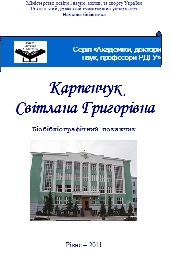 Додаткова інформація (бібліографічний опис): | Карпенчук Світлана Григорівна : біобібліогр. покажч. / М-во освіти і науки України, Рівнен. держ. гуманіт. ун-т, Наук. б-ка ; уклад.: С.Н. Грипич, І.Б. Шиховцова. – Рівне: РДГУ, 2011. – 70 с. – (Академіки, доктори наук, професори РДГУ). |