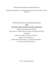 | Додаткова інформація (бібліографічний опис): | Методика викладання фахових дисциплін : робоча програма навч. дисципліни для здобувачів вищої освіти за спец. 0.23 Образотворче мистецтво, декоративне мистецтво, реставрація, напрям підготовки 02 Культура і мистецтво, освітня програма Образотворче та декоративне мистецтво / розробник М. В. Ганжа. - Рівне : РДГУ, 2025. - 14 с. |