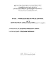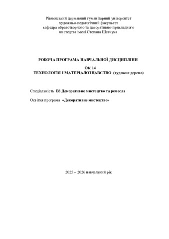 | Додаткова інформація (бібліографічний опис): | Технологія і матеріалознавство (художнє дерево) : робоча програма навч. дисципліни для здобувачів вищої освіти за спец. В3 Декоративне мистецтво та ремесла, освітня програма «Декоративне мистецтво» / розробник О. А. Сташук. - Рівне : РДГУ, 2025. - 10 с. |