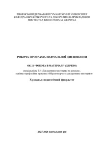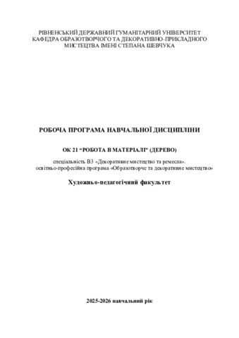 | Додаткова інформація (бібліографічний опис): | Робота в матеріалі (дерево) : робоча програма навч. дисципліни для здобувачів вищої освіти за спец. В3 «Декоративне мистецтво та ремесла», освітньо-проф. програма «Образотворче та декоративне мистецтво» / розробник О. Л. Русак. - Рівне : РДГУ, 2025. - 24 с. |