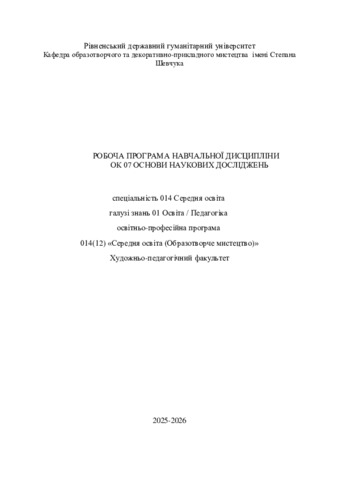 | Додаткова інформація (бібліографічний опис): | Основи наукових досліджень : робоча програма навч. дисципліни для здобувачів вищої освіти за спец. 014 Середня освіта галузі знань 01 Освіта / Педагогіка, освітньо-проф. програма 014(12) «Середня освіта (Образотворче мистецтво)» / розробник М. В. Ганжа. - Рівне : РДГУ, 2025. - 14 с. |
