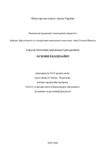 | Додаткова інформація (бібліографічний опис): | Основи екодизайну : робоча програма навч. дисципліни для здобувачів вищої освіти спец. 014 Середня освіта, галузі знань 01 Освіта / Педагогіка, освітньо-професійна програма 014(12) «Середня освіта (Образотворче мистецтво)» / розробник М. В. Ганжа. - Рівне : РДГУ, 2025. - 20 с. |