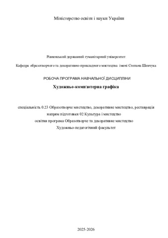 | Додаткова інформація (бібліографічний опис): | Художньо-комп'ютерна графіка : робоча програма навч. дисципліни для здобувачів вищої освіти спец. 0.23 Образотворче мистецтво, декоративне мистецтво, реставрація, напрям підготовки 02 Культура і мистецтво, освітня програма Образотворче та декоративне мистецтво / розробник М. В. Ганжа. - Рівне : РДГУ, 2025. - 17 с. |